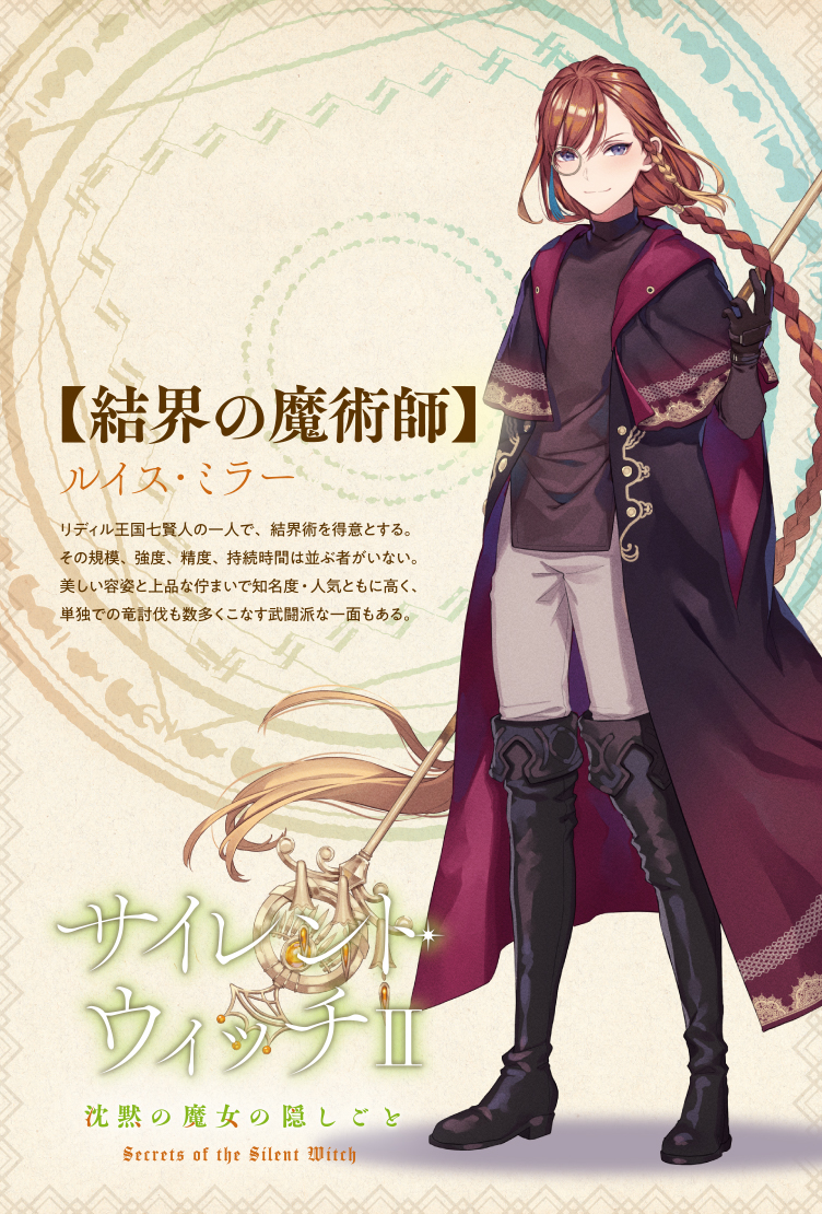王国の魔術師頂点「七賢人」の一人、史上最年少でその座に就いた少女。無詠唱魔術を生み出した才能を持ち、〈沈黙の魔女〉と呼ばれる。人見知り・あがり症で、長らく山奥で隠遁生活を送っていたが、王命により貴族校へ潜入し〈第二王子〉の護衛任務に就く。