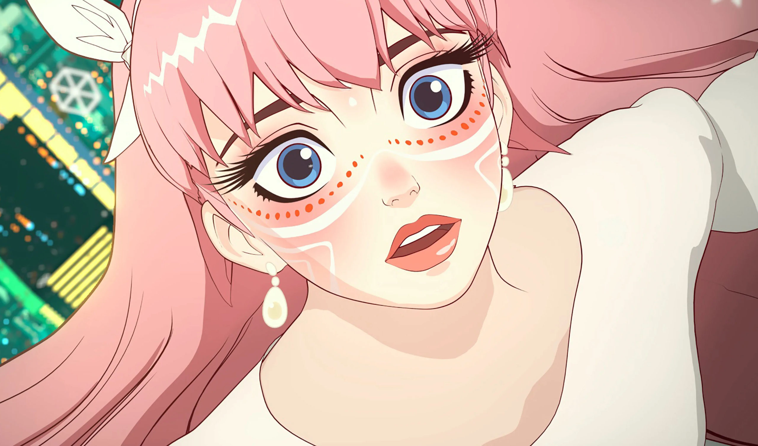 長いピンクの髪と華やかなドレスが象徴的。